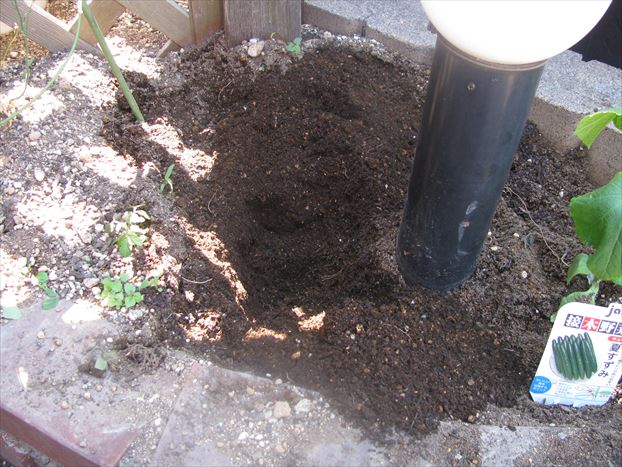 今回は、サツマイモということで、夏野菜とかの二倍ぐらい深く植え付け穴を掘りました。なんでもさつまいもは茎のわきから生えた根にできるらしく、そのためにも茎を地中に埋めないといけないとか。そのためこんなに深く掘りました。