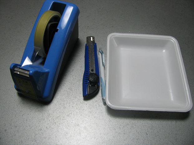 必要なものは、セロハンテープ、カッター、ボールペン、トレーです。トレーは、肉などが乗っている物でOKです。