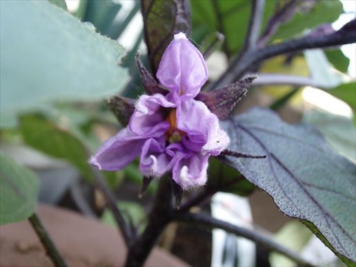 なんと!!小ナスの花がついに咲いたんですよ!!しっかり開いていないのは時間(現在6時)のせいです。