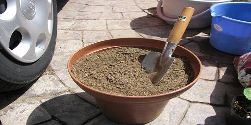 培養土に、腐葉土、草木灰、赤玉土を混ぜた土を、植木鉢に入れます。