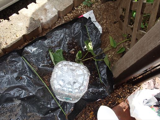 そんでもって先ほどのマルチを、いつか買った蘭支柱で固定して(使い方おかしい)、最後に先ほどのペットボトルを刺して植えつけ完了。
