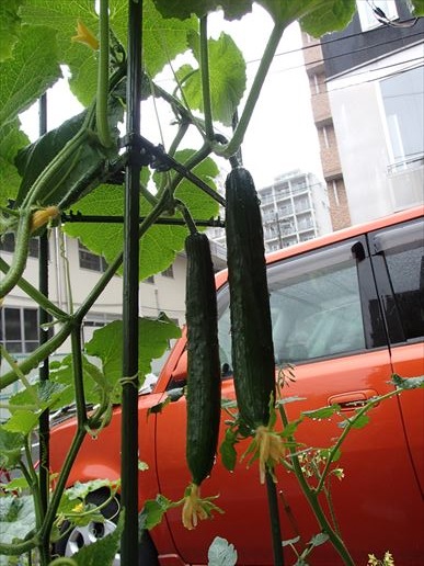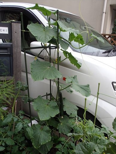 いつみても元気な胡瓜。先日先っぽが倒れてきたので少々不安でしたが、左側から脇芽が伸びるわ、雌花はさくわ、蕾はできるわ、もう元気すぎます。逆におととしの栽培日記(しかも最後放置状態)と比べると月とすっぽんですね!!