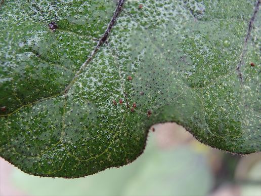 どうでしょう?写真ではあまりよくわかりませんが、少しだけですが成長が回復した気がします。粘着君のおかげでしょうかねぇ?ということで、葉の裏を見てみると…